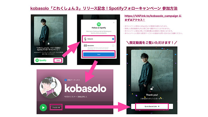 キャンペーンURLよりkobasoloのアーティストページをフォローいただくと、下記の限定動画がご覧いただけます!