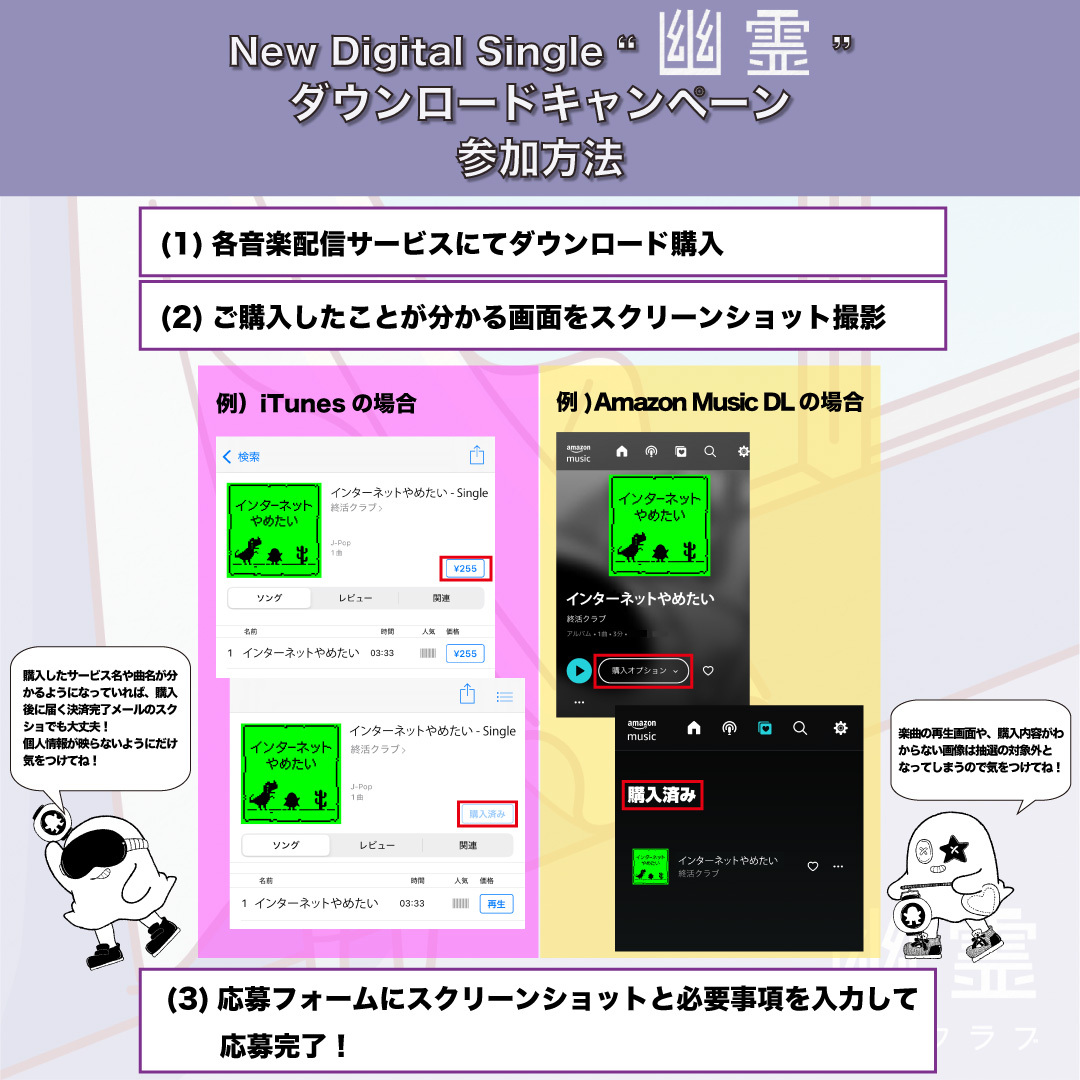 ①iTunes・レコチョク・mora・Amazon Musicにて、終活クラブ「幽霊」をダウンロード購入していただき、購入したことがわかる画面のスクリーンショット