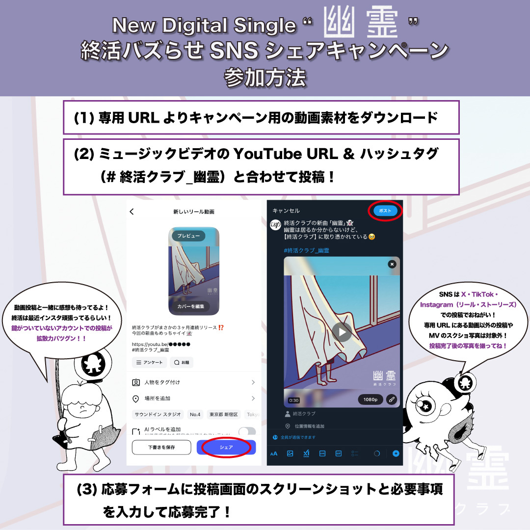 ②専用URLより、キャンペーン用の動画素材をダウンロードしていただき、「幽霊」のミュージックビデオのYouTubeリンク(https://youtu.be/zHQJ6CxPmSU)とハッシュタグ「#終活クラブ_幽霊」を記載の上、X(旧Twitter)、TikTok、もしくはInstagramストーリーズかリール、に投稿した、投稿画面のスクリーンショット