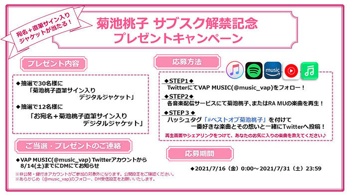 更に、Twitterでプレゼントキャンペーンがスタート。「#ベストオブ菊池桃子」をつけて楽曲への想いと一緒にTwitterへ投稿すると、抽選で「菊池桃子直筆サイン入りデジタルジャケット」がプレゼントされる。参加してレアなサイン入りの懐かしのジャケットをゲットしてみてください!